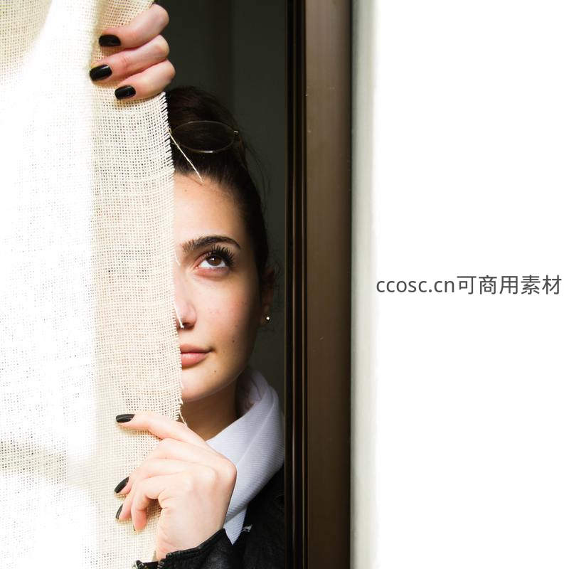 一位女子从白色纱帘后探出头来,眼神带着一丝好奇与神秘,黑白指甲与简约衣着形成对比,营造出引人遐想的戏剧性瞬间。