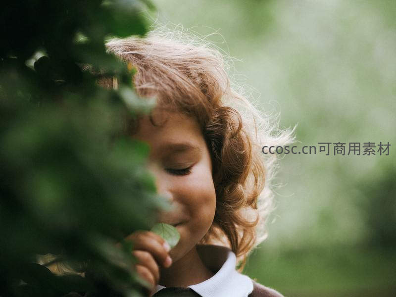 一个卷发孩子躲在茂密的绿叶后,嘴角带着狡黠的微笑,阳光透过树叶洒下斑驳光影,画面充满童真、好奇与自然的生机。