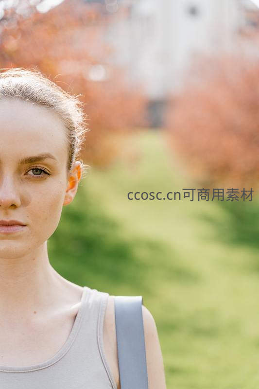 一位年轻女子站在秋日公园中,身后是模糊的红叶与绿草,她神情平静,肩挎灰色包带,享受片刻宁静的户外时光。