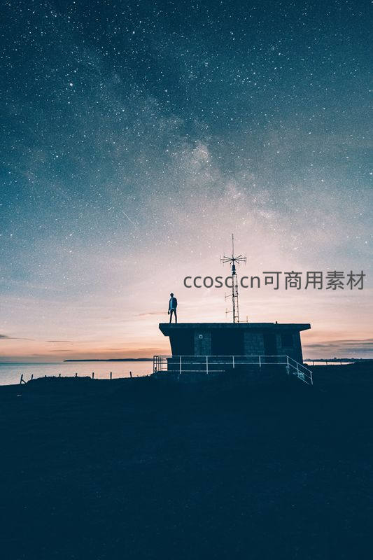 黄昏余晖与漫天繁星交汇,一人独立海边小屋之巅,远眺浩瀚银河,画面宁静而富有哲思,引人遐想。