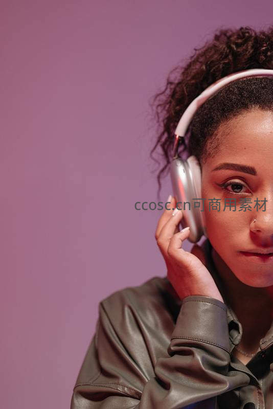 一位卷发女性佩戴银色头戴式耳机,神情专注沉浸在音乐中,背景为柔和紫色,搭配皮质外套,展现现代都市青年的潮流生活方式。