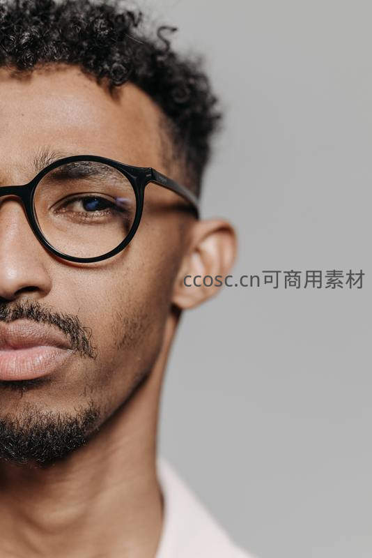 一位戴黑框眼镜的男士侧脸特写,神情专注沉思,背景为纯净灰色,突显其理性气质与内敛个性,适合表现职场或学术场景。
