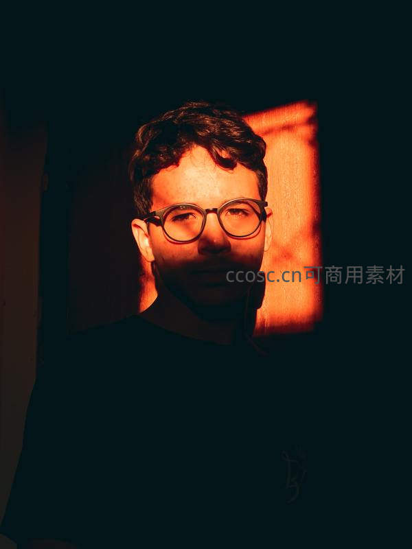 在温暖的侧光照射下,一位戴眼镜的男子凝视镜头,面部轮廓分明,营造出神秘而富有故事感的艺术氛围。