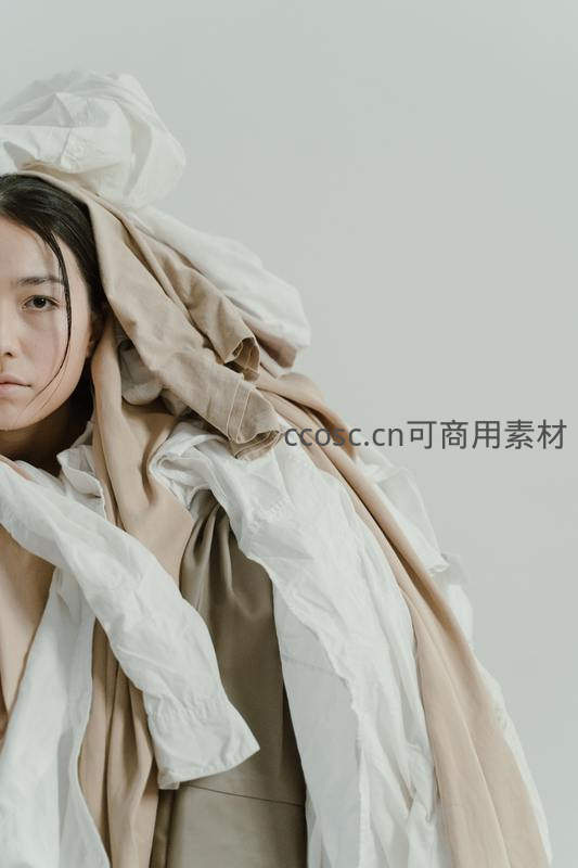 一位女子被大量米白色与浅棕色衣物环绕,神情略带疲惫与沉思,营造出一种被日常琐事淹没却仍保持内心宁静的现代生活意境。