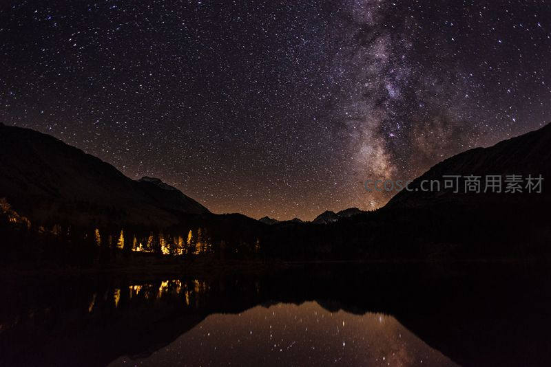 宁静的湖面完美倒映着璀璨银河与连绵山脉,远处灯光点缀林间,构成一幅对称的星空画卷。