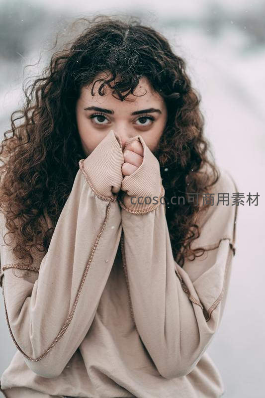 在飘雪的户外,一位拥有蓬松卷发的女子穿着米色毛衣,双手捂住口鼻,眼神直视镜头,传递出冬日的清冷与一丝俏皮。