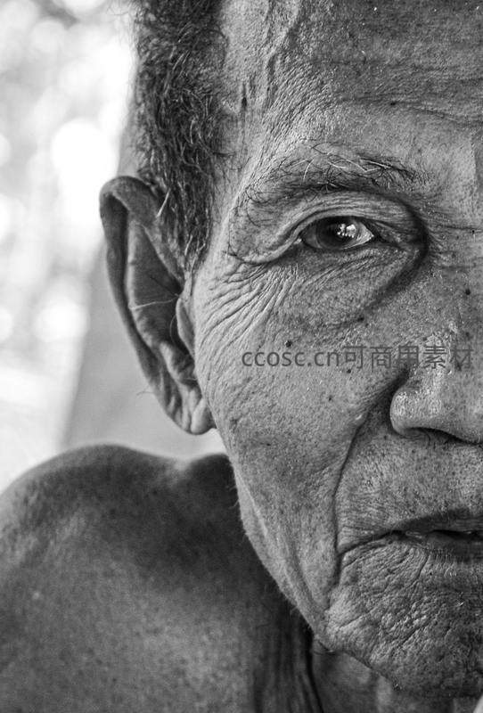 黑白特写镜头捕捉一位老人的侧脸,深邃的眼窝、清晰的皱纹与沉静的眼神,无声诉说着时光的故事,充满人文关怀与艺术感染力。