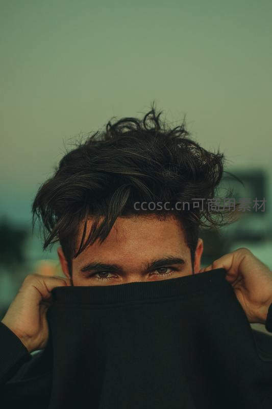 一位年轻男子用黑色卫衣的衣领遮住下半张脸,仅露出专注而深邃的双眼,凌乱的发型与柔和的背景形成对比,营造出神秘而富有故事感的氛围。
