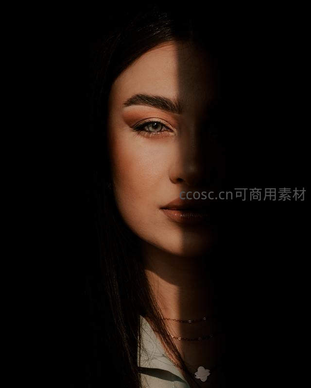 柔和光线勾勒出女性半边脸庞,另一半隐于黑暗,突出立体五官与精致妆容,营造神秘而优雅的视觉张力。