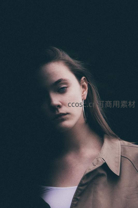 女子身着米色衬衫与白色内搭,在深色背景下侧脸凝视,神情安静内敛,耳环与柔和光线增添画面质感与层次。