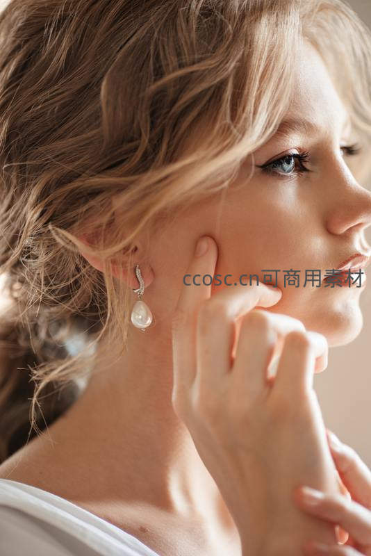 新娘侧颜特写,佩戴着精致的水滴形珍珠耳环,手指轻触脸颊,眼神温柔,金色卷发与柔和光线营造出浪漫唯美的氛围。