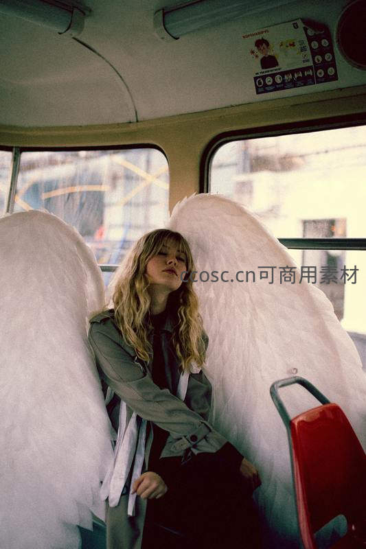 一位金发女孩身着风衣,背后佩戴巨大白色天使翅膀,安静坐在行驶中的公交车内,窗外城市光影流动,营造出超现实的浪漫氛围。