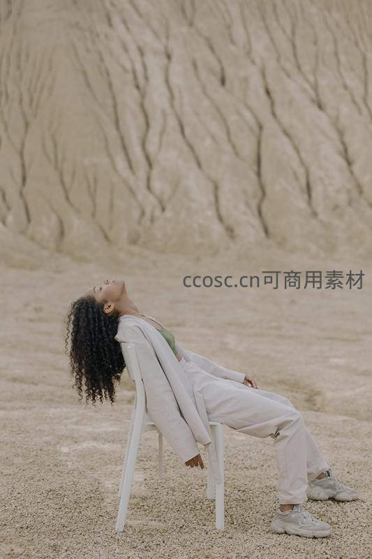 一位黑卷发女子在荒漠地貌前的白色椅子上仰面放松,闭目享受自然,背景是奇特的土层纹理,画面充满诗意与宁静感。