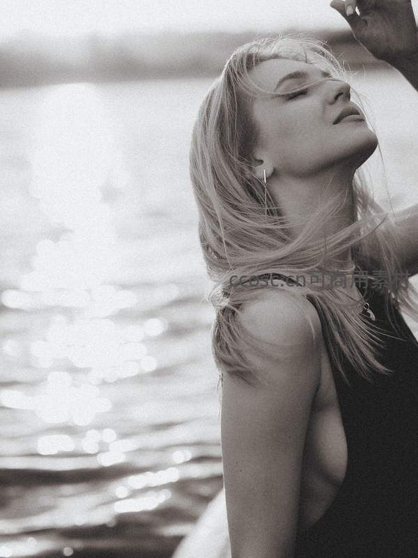 黑白影像中女子闭眼仰面,微风拂动发丝,背景波光粼粼的水面营造静谧氛围,传递出与自然共鸣的平和与惬意。