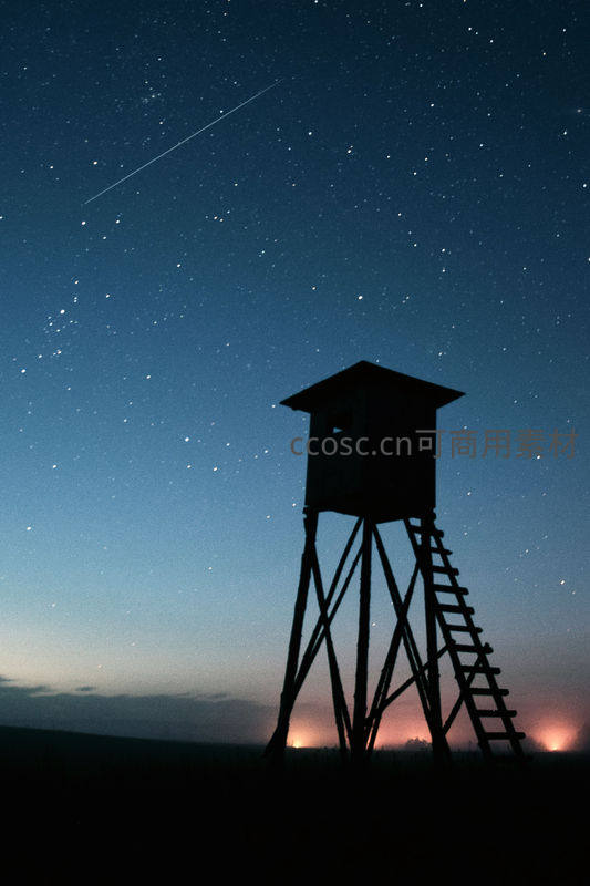 瞭望塔剪影下,流星划过繁星点点的夜空