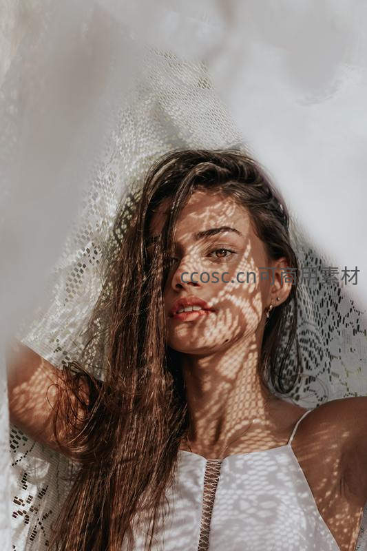 阳光透过白色蕾丝织物,在女子脸上投下斑驳的光影,营造出梦幻、宁静且充满艺术感的氛围。