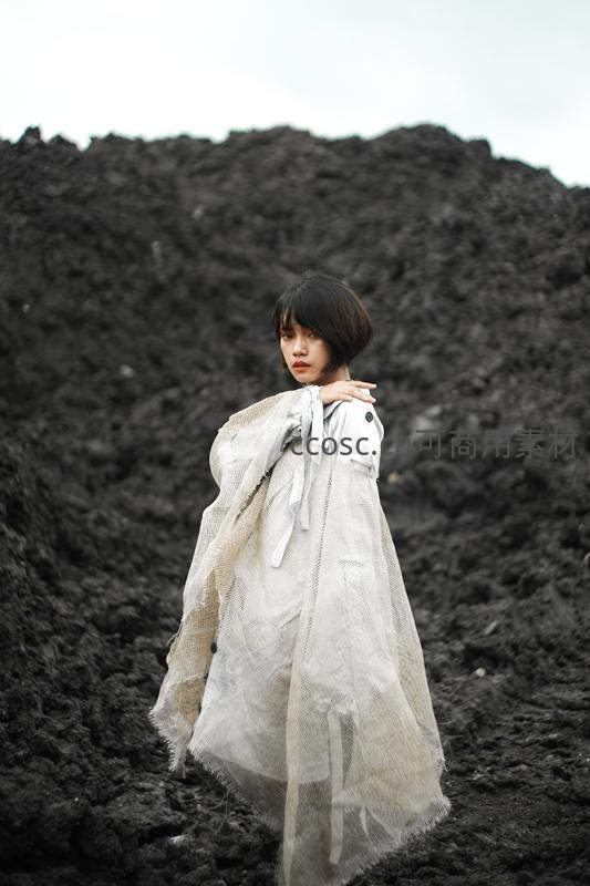 一名短发女子身披白色宽松外衣,伫立在粗犷的黑色土堆前,表情凝重,强烈的色彩与质感对比营造出戏剧性艺术氛围。