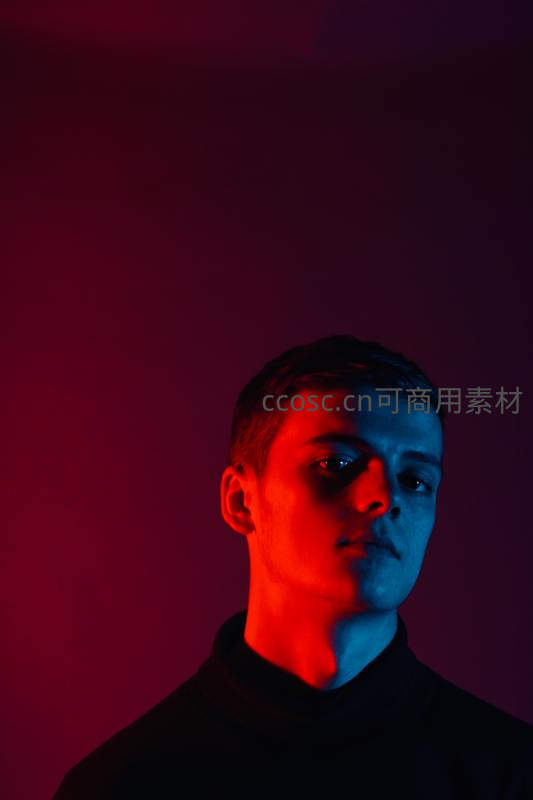 青年男子在红蓝双色霓虹灯光映照下,面部轮廓分明,神情冷峻,背景深邃朦胧,营造出强烈的视觉冲击力与神秘氛围。