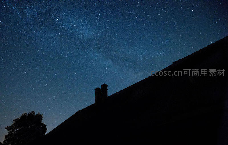 在静谧的夜晚,璀璨的银河横跨天际,下方是房屋屋顶和烟囱的黑色剪影,构成一幅充满诗意与宇宙感的宁静画面。