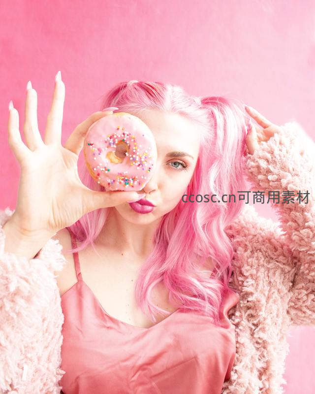 粉发少女身穿毛绒外套,用彩色糖霜甜甜圈遮住一只眼睛,嘟嘴卖萌,背景纯粉,整体画面甜美梦幻,充满少女心。