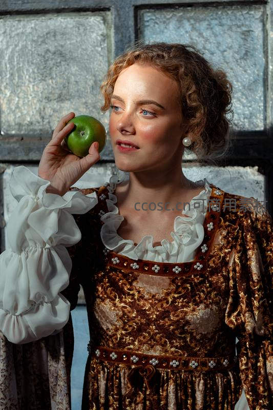 身着华丽复古长裙的女子,手持青苹果,眼神温柔而深邃,背景是斑驳的石墙,营造出浓郁的历史氛围与艺术感。