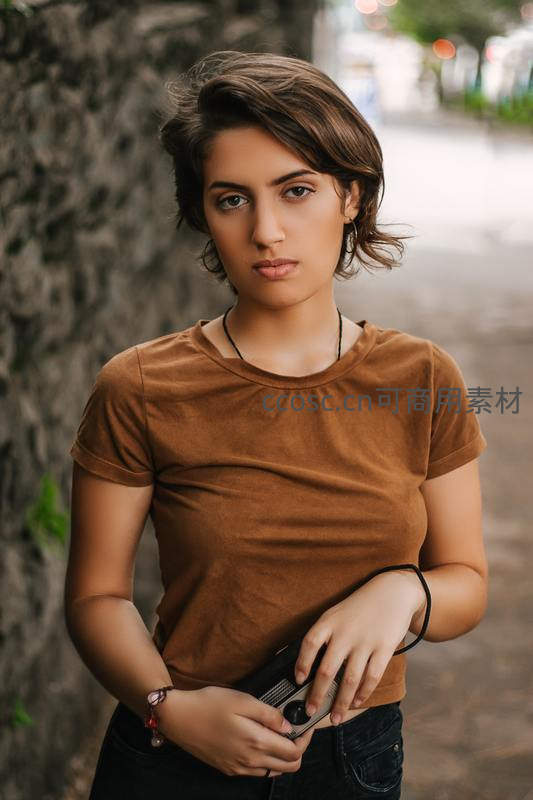 一位短发女子倚靠树干,手持复古相机,眼神平静望向镜头。柔和的自然光洒在她身上,背景是模糊的城市街道,充满文艺气息。