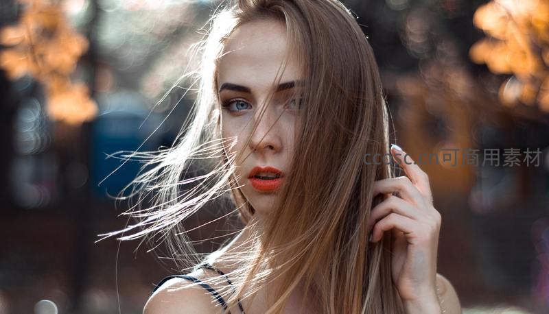 一位年轻女性在秋日阳光下,微风吹拂着她飘逸的长发,眼神专注而迷人,背景是温暖的秋色树影,充满自然与时尚气息。