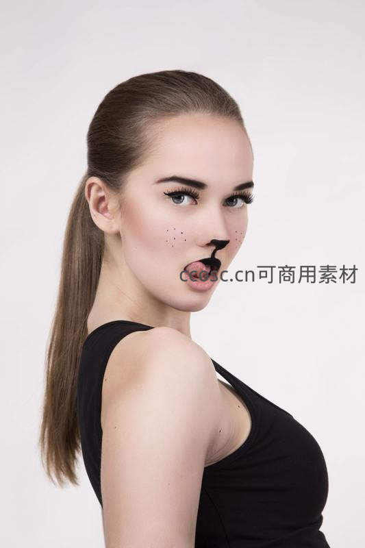 年轻女孩在纯白背景下做出俏皮表情,脸上画着黑色猫鼻子和胡须,伸出舌头,展现出活泼可爱的个性和创意妆容的魅力。