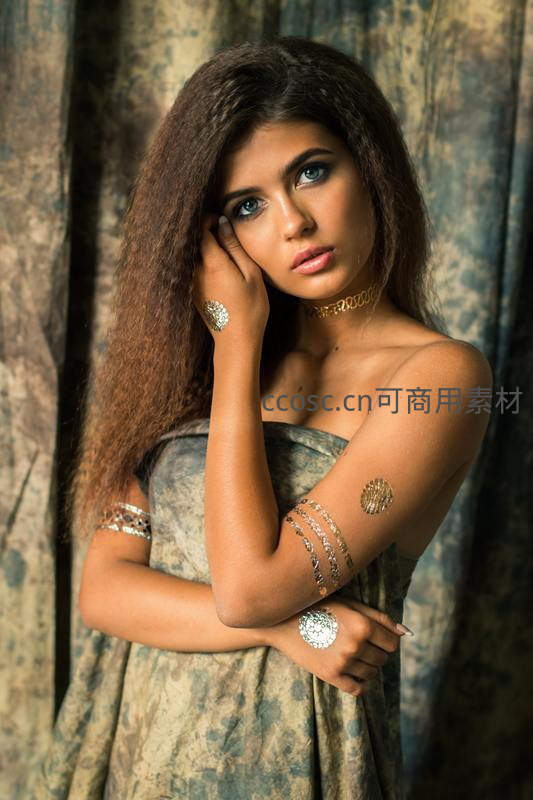 一位拥有深邃眼眸和浓密卷发的女性,佩戴着精致的金色颈链与手镯,身着印花抹胸裙,在斑驳幕布前优雅托腮,散发神秘异域魅力。