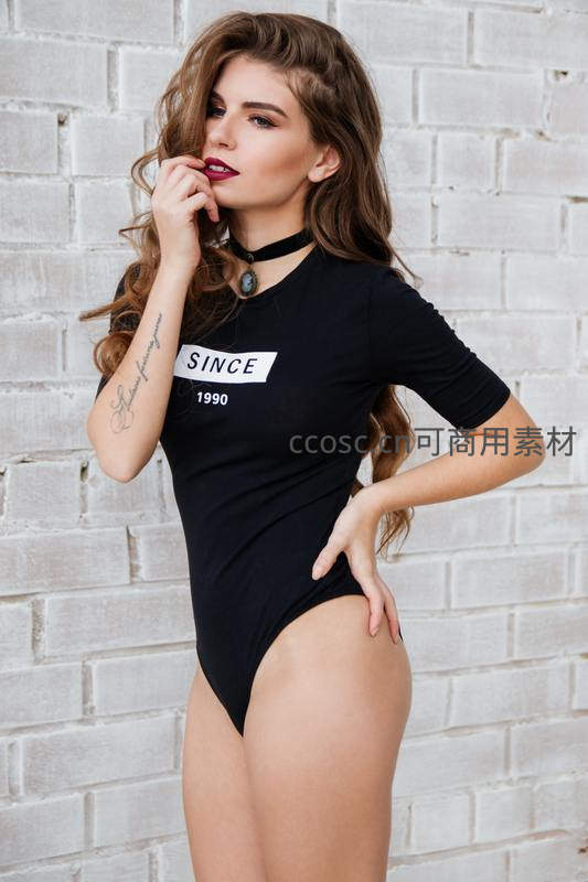 一位穿着印有“SINCE 1990”字样的黑色紧身连体衣的女子,站在白色砖墙前,手托下巴,展现自信姿态与独特个性风格。