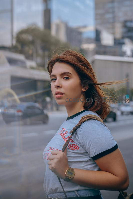 女孩站在城市街道旁,微风吹动她的发丝,身穿印花T恤与牛仔裤,背着单肩包,腕表点缀细节,展现出都市生活的随性与活力。