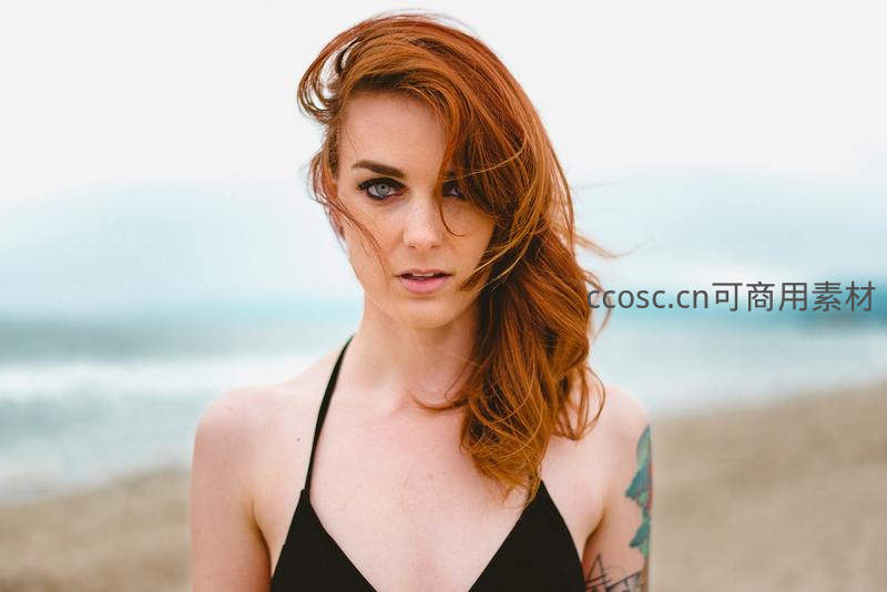 一位拥有迷人红发和蓝色眼眸的女性在海边沙滩上,身穿黑色吊带泳衣,肩部有彩色纹身,海风轻拂发丝,眼神直视镜头。