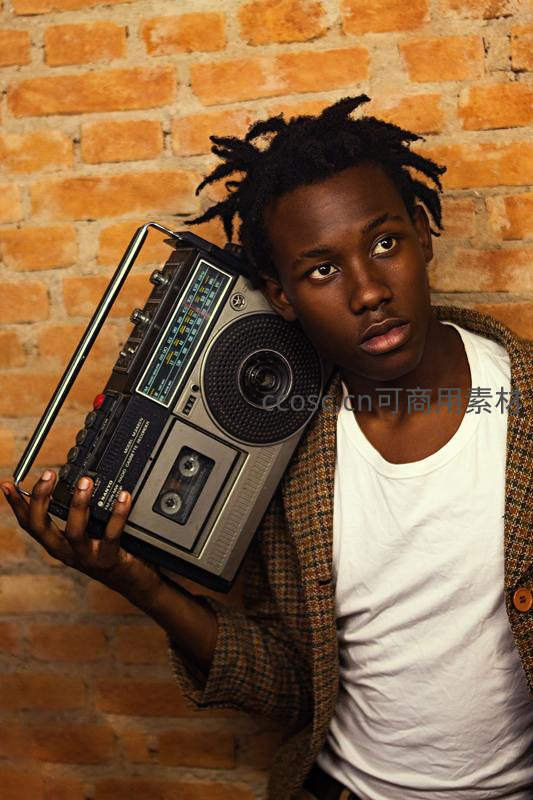 一位黑人青年身着格纹外套,手持一台经典磁带收音机,倚靠在红砖墙前,眼神专注而富有表现力,展现出复古与现代交融的街头风格。