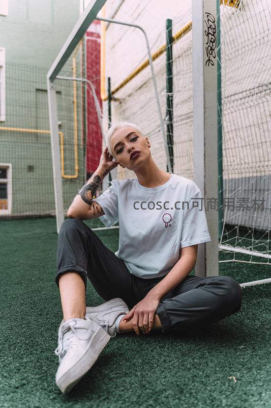 一位染着白发、手臂有纹身的年轻女子坐在人造草坪的足球场边,身穿简约T恤和休闲裤,姿态慵懒却充满个性,背景是球门与涂鸦墙。
