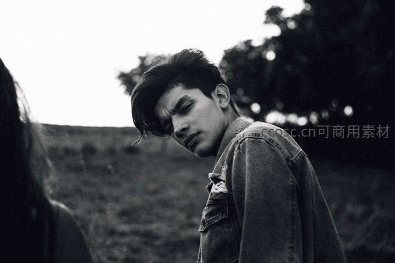 在开阔田野背景下,一位穿着破洞牛仔外套的青年低头沉思,黑白影像渲染出青春的迷茫与诗意氛围。