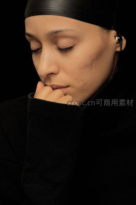 一位女性闭目沉思,手轻托下巴,神情宁静,黑色服饰与背景衬托出她内心的平和与专注。