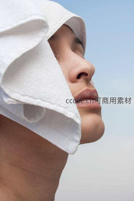 人物用白色毛巾半遮面部,仰头享受阳光与蓝天,展现夏日清爽与惬意,突出肌肤质感与毛巾纹理细节。