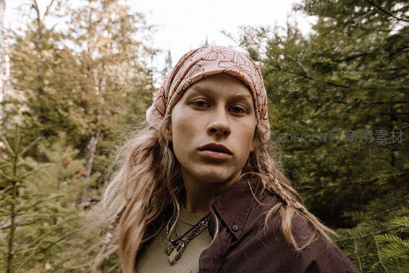 长发女孩戴印花头巾、编着麻花辫,置身于松林之中,眼神直视镜头,充满野性与自由气息,背景绿意盎然。