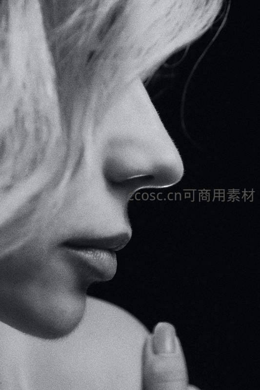 黑白画面捕捉女性优雅的侧脸轮廓,手指轻柔触碰肩颈,线条流畅柔和,整体氛围静谧安详,展现人体美学与内在情感的微妙表达。