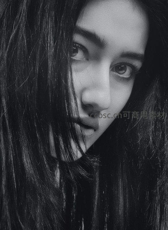 发丝轻拂,黑白世界里的凝望双眸