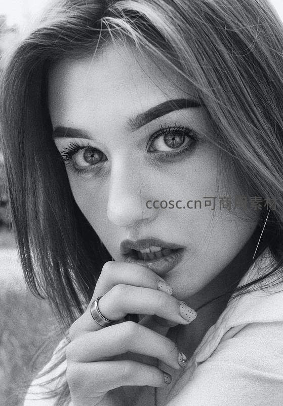 黑白风格的人像特写,女子眼神直视镜头,手指轻触唇边,指甲上有精致美甲,展现出一种沉静又略带神秘的氛围。