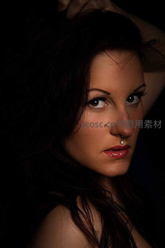 在深邃的黑色背景下,女性直视镜头,红唇与闪亮鼻钉在聚光灯下格外突出,眼神中透着自信与神秘,散发冷艳时尚气息。
