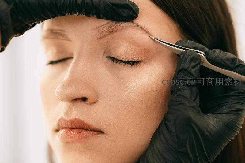 一位戴着黑色手套的美容师正在为顾客精心修剪眉毛,展现专业细致的美容服务过程,体现对细节的关注与精致生活追求。