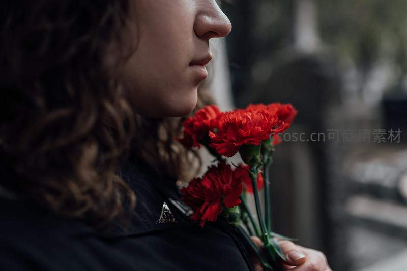 一位女子在肃穆环境中手持鲜艳红康乃馨,神情沉静,表达深切哀思与缅怀之情,氛围庄重而感人,传递情感力量。