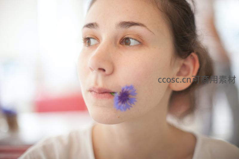 年轻女孩将一朵蓝色小花轻衔于唇边,目光柔和望向远方,展现出自然清新的美感与青春活力,画面如诗般宁静美好。