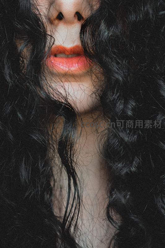 浓密卷曲的黑发半遮面容,仅露出饱满红唇与鼻尖,营造神秘而诱人的视觉效果,突出女性魅力与艺术感的结合。