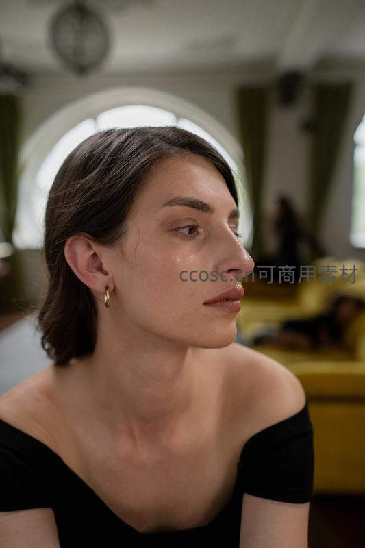 女性身着黑色露肩装,在柔和室内光线下侧首凝望,背景黄沙发与拱窗增添空间层次,整体散发安静优雅的生活质感。