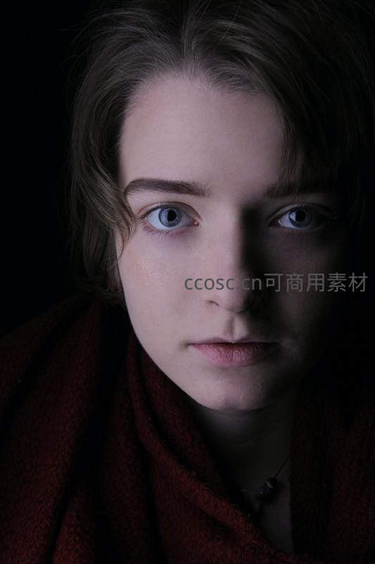 在深邃的黑暗背景中,一位少女的面部被一束柔光点亮,她清澈的蓝色眼眸直视镜头,红围巾增添一抹暖色,营造出静谧、神秘且充满戏剧张力的视觉氛围。