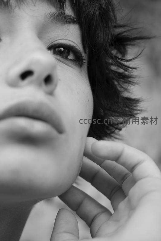 黑白特写中,女子手指轻触脸颊,眼神深邃凝视远方,传递出内省与沉静的情绪,画面充满艺术感染力。
