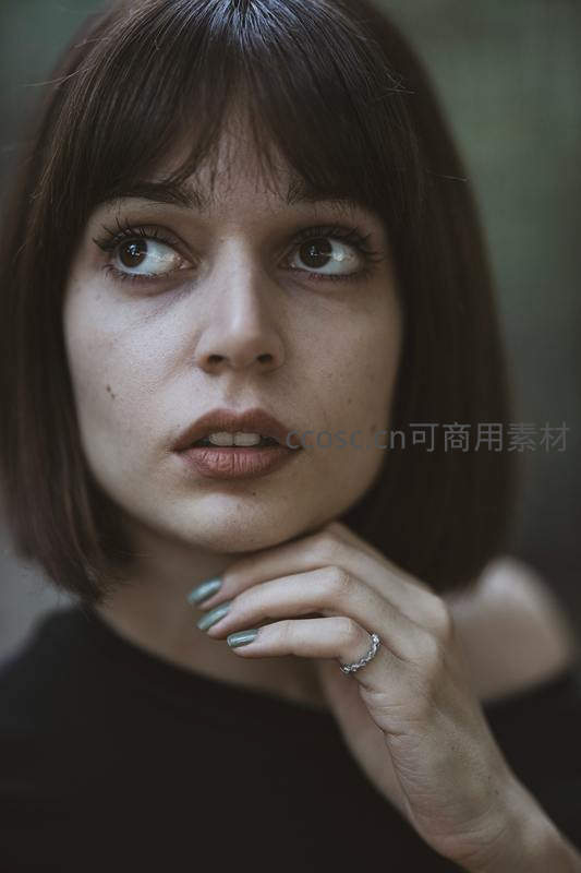 少女眼神向上凝望,手托下巴,银色戒指点缀指尖,面部表情若有所思,整体氛围安静而富有故事性。